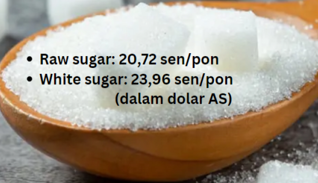 Harga raw sugar berjangka #11 pada 13 Desember 2024: 20,72 sen/pon (dalam dolar AS). Harga tercatat saat penutupan pasar di New York, Amerika Serikat (AS). Ini menunjukkan -0,17 sen/pon atau -0,81 persen dibanding harga penutupan pada 12 Desember.
