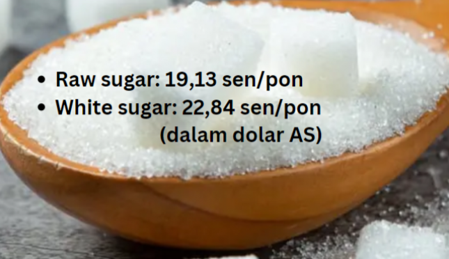 Harga raw sugar berjangka #11 pada 30 Desember 2024: 19,13 sen/pon (dalam dolar AS). Harga tercatat saat penutupan pasar di New York, Amerika Serikat (AS). Ini menunjukkan -0,24 sen/pon atau -1,24 persen dibanding harga penutupan pada 27 Desember.