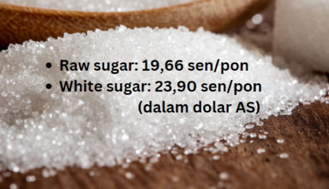 Harga raw sugar berjangka #11 pada 4 Februari 2025: 19,66 sen/pon (dalam dolar AS). Harga tercatat saat penutupan pasar di New York, Amerika Serikat (AS). Ini menunjukkan +0,40 sen/pon atau +2,08 persen dibanding harga penutupan pada 3 Februari.
