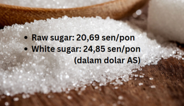 Harga raw sugar berjangka #11 pada 19 Februari 2025: 20,69 sen/pon (dalam dolar AS). Harga tercatat saat penutupan pasar di New York, Amerika Serikat (AS). Ini menunjukkan +0,17 sen/pon atau +0,83 persen dibanding harga penutupan pada 18 Februari.