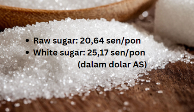 Harga raw sugar berjangka #11 pada 26 Februari 2025: 20,64 sen/pon (dalam dolar AS). Harga tercatat saat penutupan pasar di New York, Amerika Serikat (AS). Ini menunjukkan -0,82 sen/pon atau -3,82 persen dibanding harga penutupan pada 25 Februari.