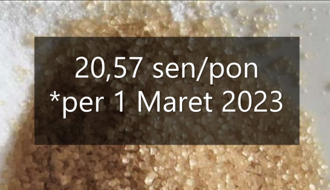 Harga raw sugar dunia berjangka no.11 per 1 Maret 2023 di Nasdaq: 20,57 sen/pon (dalam dolar AS). Harga tercatat pada saat penutupan pukul 17.00 waktu New York, Amerika Serikat. Ini menunjukkan penurunan 0,151 sen atau 6,84 persen dibanding harga penutupan sehari sebelumnya, pada Rabu (28/2/2023). *