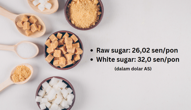 Harga raw sugar berjangka no.11 per 11 Mei 2023 di Nasdaq: 26,02 sen/pon (dalam dolar AS). Harga tercatat pada saat penutupan Nasdaq pukul 17.00 waktu New York, Amerika Serikat (AS). Ini menunjukkan -0,64 sen/pon atau -2,40 persen dibanding harga penutupan pada 10 Mei 2023 waktu AS.