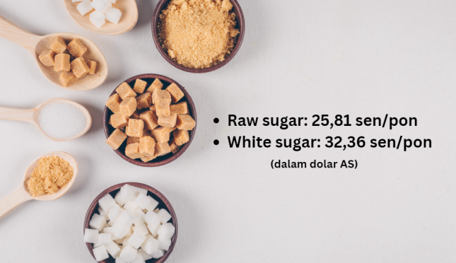 Harga raw sugar berjangka no.11 per 23 Mei 2023 di Nasdaq: 25,81 sen/pon (dalam dolar AS). Harga tercatat pada saat penutupan Nasdaq pukul 17.00 waktu New York, Amerika Serikat (AS). Ini menunjukkan -0,18 sen/pon atau -0,69 persen dibanding harga penutupan pada 22 Mei 2023 waktu AS.