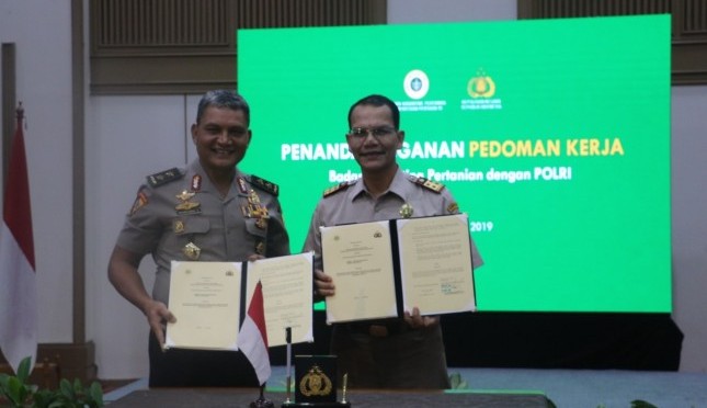 AGRONET -- Kementerian Pertanian (Kementan) melalui Badan Karantina Pertanian (Barantan) melakukan penandatanganan nota kesepahaman dengan Kepolisian RI di Auditorium Gedung D, Jakarta Selatan, Rabu (17/7). Kerjasama ini meliputi pengawasan barang dan penindakan pelanggaran seperti penyelundupan.