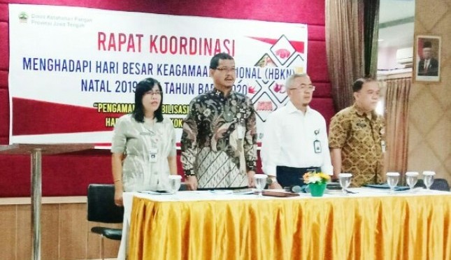 Kepala Dinas Ketahanan Pangan Provinsi Jawa Tengah yang diwakili oleh Kepala Bidang Distribusi, Broto Rini, menyampaikan untuk pasokan dan harga pangan di Jawa Tengah terpantau aman. “Secara umum, kondisi ketersediaan komoditas pangan pokok dan strategis masih surplus, antara lain beras, jagung, daging, cabai, dan bawang. Khusus untuk kedelai memang agak mengalami defisit,” ujarnya.