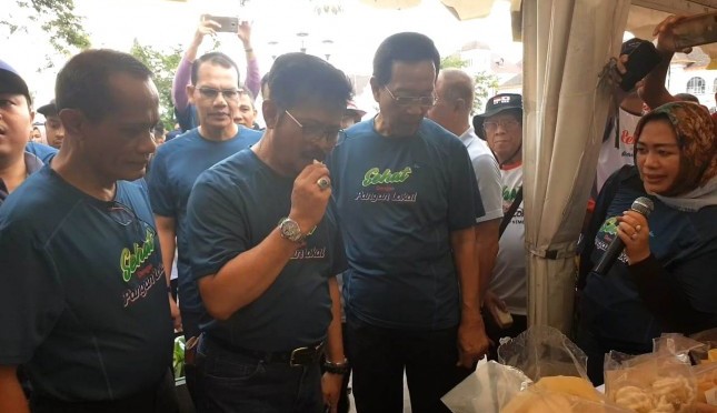 Menteri Pertanian Syahrul Yasin Limpo (kedua dar kiri) mencicipi produk makanan olahan di salah satu booth makanan pada acara Gelar Pangan Lokal Berbasis UMKM di kawasan Malioboro, Yogyakarta, Minggu (8/12). | Sumber Foto:Agronet/360