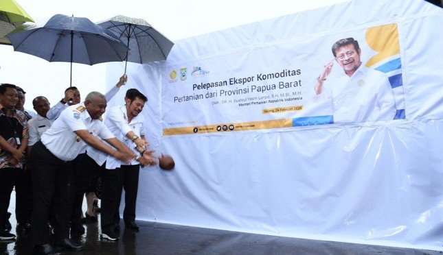 Menteri Pertanian Syahrul Yasin Limpo melepas buah merah ke Chekoslovakia dan komoditas lainnya di Pelabuhan Laut Sorong, Kota Sorong, Rabu (26/2). | Sumber Foto:Humas Kementan