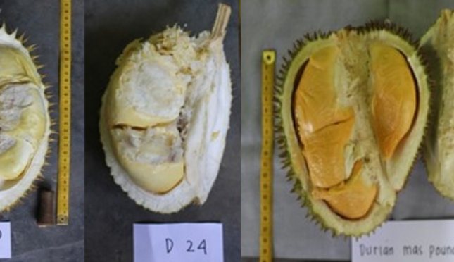 Untuk pemanfaatan dan pengembangan SDG lokal, durian Maspound paling berpotensi karena ketebalan kulit sedang, rasa manis, tekstur daging buah lembut, warna daging buah kuning emas, ukuran buah sedang, serta jumlah buah per pohon cukup banyak. | Sumber Foto: Balitbangtan