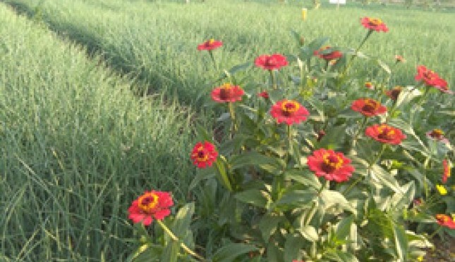 Refugia ditanam di pinggir areal pertanaman bawang merah, selain memperindah pemandangan, juga menjadi tempat berlindung dan hidup bagi musuh alami OPT. | Sumber Foto: Humas Ditjen Hortikultura