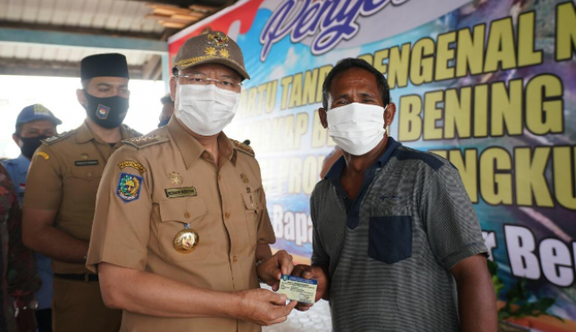 Gubernur Bengkulu Rohidin Mersyah serahkan kartu tanda pengenal nelayan penangkap benih bening lobster di PPI pelabuhan Pulau Baai Bengkulu. | Sumber Foto:Pemrpov Bengkulu