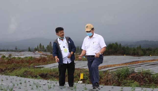 Menteri Pertanian Syahrul Yasin Limpo (kiri) bersama Menteri Koordinator Bidang Maritim dan Investasi Luhut Binsar Pandjaitan saat meninjau langsung lahan food estate di Kabupaten Humbang Hasundutan. | Sumber Foto:Humas Kementan