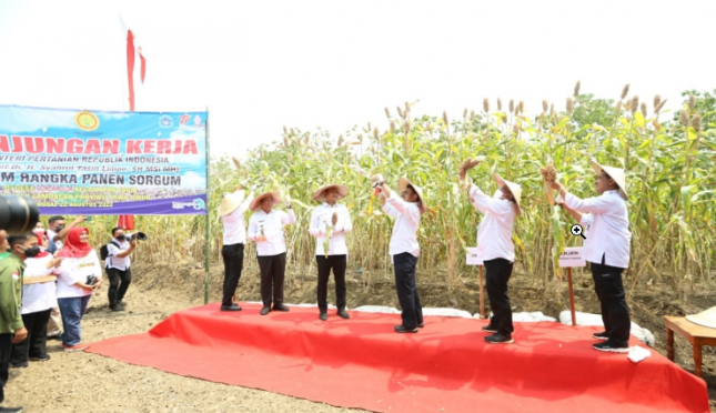 AGRONET -- Menteri Pertanian Syahrul Yasin Limpo (Mentan SYL) bersama Bupati Lamongan, Yuhronur Efendi melakukan panen sorgum di Kecamatan Sugio, Kabupaten Lamongan, Jawa Timur, Senin, 22 Agustus 2022. Menurut Mentan, sorgum adalah komoditas penting yang bisa digunakan sebagai bahan makanan pengganti gandum.