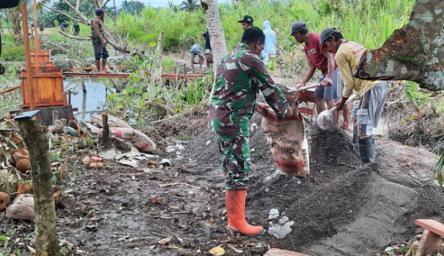 Lanjutnya, Koramil 1801-02/Warmare bersama Kelompok Petani hari ini melaksanakan pendorongan material ke sasaran, pengecoran tiang penyangga pipa, penggalian parit pipa pembagi air dan pembuatan bak pembagi air.