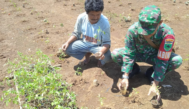 AGRONET -- Babinsa melaksanakan kegiatan Pembinaan Ketahanan Wilayah yang dilakukan di wilayah kampung binaannya. Kegiatan ini dalam rangka meningkatkan hubungan sosial kemasyarakatan antara Babinsa dan masyarakat itu sendiri. Seperti yang dilakukan oleh Babinsa Susweni Serma Isak Lating membantu salah satu petani menaman tomat di lahan kebun di Kampung Susweni Distrik Manokwari Timur, Manokwari, Papua Barat, Minggu (07/04/2024).