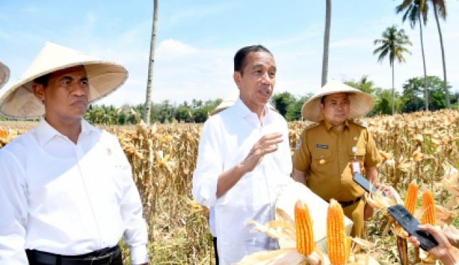 AGRONET-- Presiden Joko Widodo (Jokowi) bersama Menteri Pertanian (Mentan) Andi Amran Sulaiman meninjau jalannya panen raya jagung di Desa Kotaraja, Kecamatan Dulupi, Kabupaten Boalemo, Provinsi Gorontalo. Presiden mengaku senang karena produksi di sana mengalami peningkatan alias melimpah ruah.