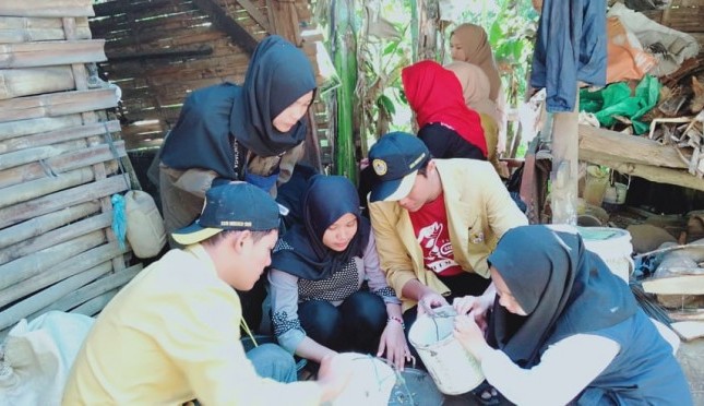 Pengukuran nira dengan laru tangkis di rumah Bu Saimah bersama tim mahasiswa Unsoed. | Sumber Foto:Dok Unsoed - Alief Einstein