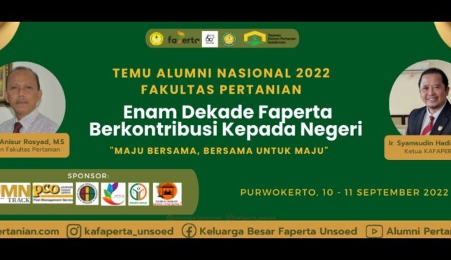 SH Sutarto mengatakan bahwa Keluarga Alumni Fakultas Pertanian Universitas Jenderal Soedirman (KAFaperta Unsoed) menyelenggarakan Temu Alumni Nasional 2022 yang dilaksanakan pada tanggal 10 - 11 September 2022 di Gedung A Fakultas Pertanian Unsoed, Purwokerto, Jawa Tengah.
