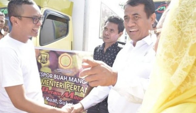 Direktur Operasional PT. Manggis Elok, Ihsan berjabat tangan dengan Mentan Andi Amran Sulaiman saat launching buah manggis ke Tiongkok, akhir Februari lalu. | Sumber Foto:Dok Kementan