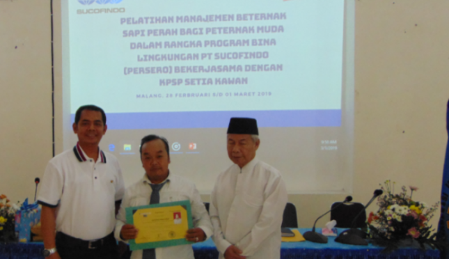 Penyerahan piagam kepersertaan pelatihan yang diberikan oleh Ketua Unit PKBL PT Sucofindo (Persero) Eka Abdullah dan Ketua Umum KPSP HM. Koesnan kepada peserta pelatihan. | Sumber Foto:Dok Humas Sucofindo