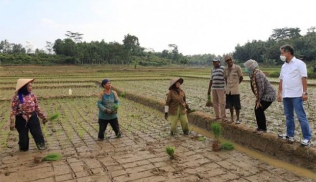 Direktur Utama Bank BRI Sunarso dan Wakil Gubernur Provinsi Lampung Hj. Chusnunia Chalim dan rombongan, turun ke sawah untuk berbincang langsung dengan Petani. | Sumber Foto:Dok BRI