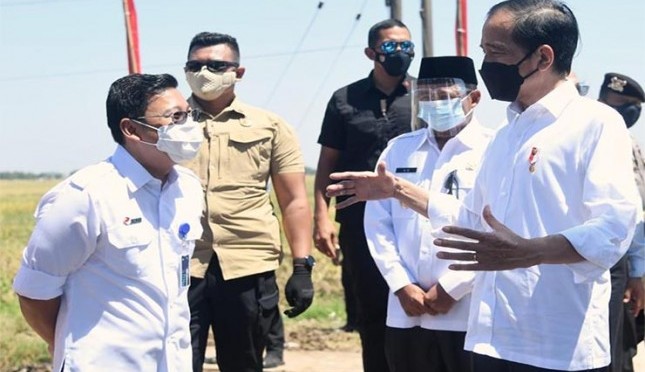 Direktur Utama PT RNI (Persero), Arief Prasetyo Adi bersama dengan Presiden Jokowi saat kunjungan kerja Panen raya padi di desa Wanasari kecamatan Bangodua Kabupaten Indramayu provinsi Jawa Barat masa tanam 1 tahun 2021. | Sumber Foto:Dok RNI