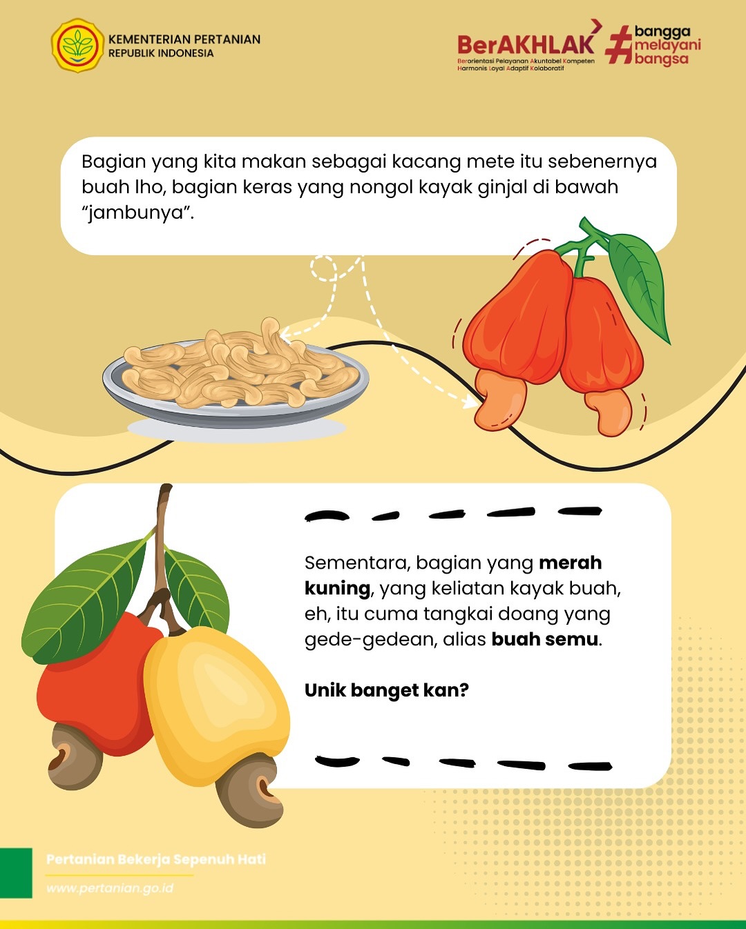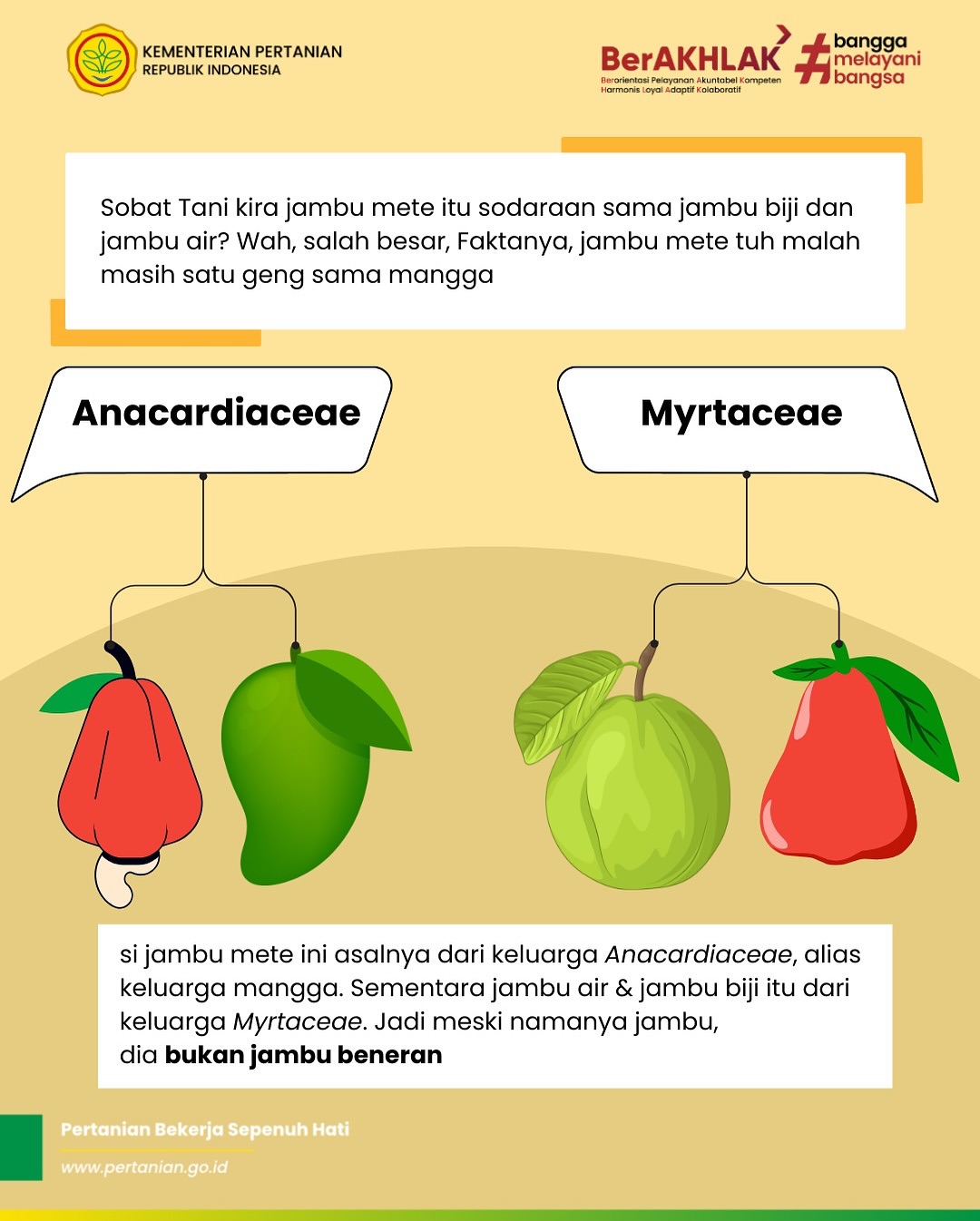 AGRONET -- Jangan terkecoh dengan namanya, ya! Jambu mete memang disebut “jambu”, tapi tanaman ini bukan bagian dari keluarga jambu-jambuan (Myrtaceae). Jambu mete atau kacang mete sebenarnya berasal dari keluarga Anacardiaceae, satu keluarga dengan mangga dan kedondong.