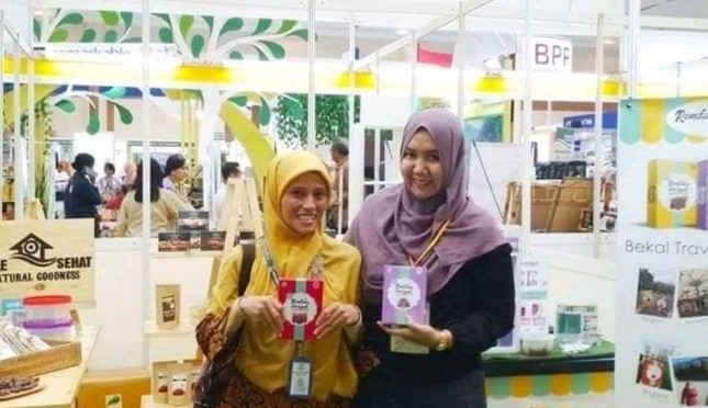 Margaretha Sari (kanan), pemilik Rendang Den Lapeh, saat pameran di Agrinex 2018