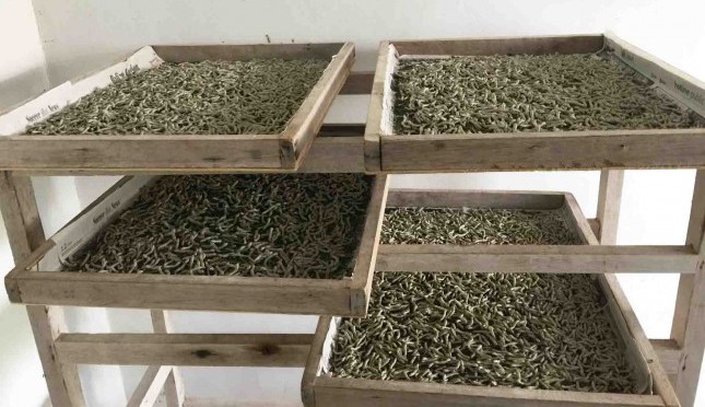 Setelah menjadi ulat dewasa, dibutuhkan lagi waktu sekitar 5 hari, agar kokon atau kepompong dapat dipanen. Kepompong yang berwarna putih bersih ini, diseleksi dahulu, dipilih yang kualitasnya bagus, sebelum kemudian dipintal menjadi benang sutera yang kuat dan indah.