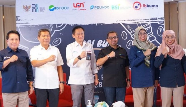 AGRONET -- Direktur Utama ID FOOD Frans Marganda Tambunan bersama Sestama Badan Pangan Nasional Sarwo Edhy dan jajaran direksi ID FOOD lainnya seperti Direktur Keuangan dan Manajemen Risiko Thomas Hadinata, Direktur Komersial...