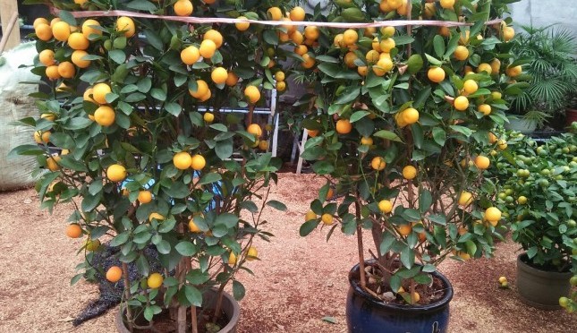 Dari Cina, pohon-pohon jeruk itu sudah berbuah. Pohon sudah ditempatkan di dalam vas yang bercorak khas Tionghoa, seperti gambar naga.