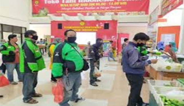 Kerjasama Kementerian Pertanian (Kementan) dengan Gojek membuahkan hasil positif. Banyaknya orderan yang masuk ke Gojek terlihat dari antrean Driver Gojek di Toko Tani Indonesia Center (TTIC) Pasar Minggu, Jakarta Selatan. | Sumber Foto:Dok Kementan