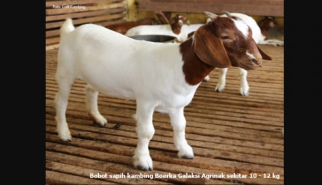AGRONET -- Badan Penelitian dan Pengembangan Pertanian (Balitbangtan) melalui Loka Penelitian Kambing Potong Sei Putih (Lolit Kambing) terus mendiseminasikan kambing Boerka Galaksi Agrinak. Saat ini, kambing unggulan Balitbangtan tersebut telah disebar di lima belas provinsi di Indonesia. Kambing Boerka Galaksi Agrinak (BGA) merupakan kambing hasil persilangan antara pejantan unggul kambing Boer (asli Afrika Selatan) dan kambing Kacang (lokal Indonesia). Kambing ini termasuk ke dalam tipe kambing pedaging dengan pertumbuhan yang relatif cepat.