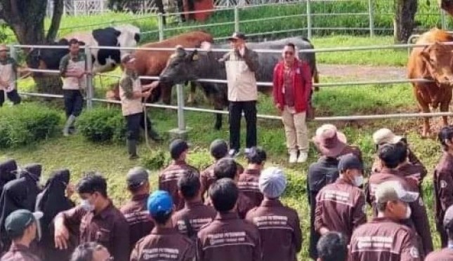 Sub Koordinator Pemeliharaan Ternak Ono Syamyono S.Pt M.S mengajak rombongan melihat bull show dan menjelaskan terkait dengan menejemen pemeliharaan ternak yang ada di BIB Lembang.